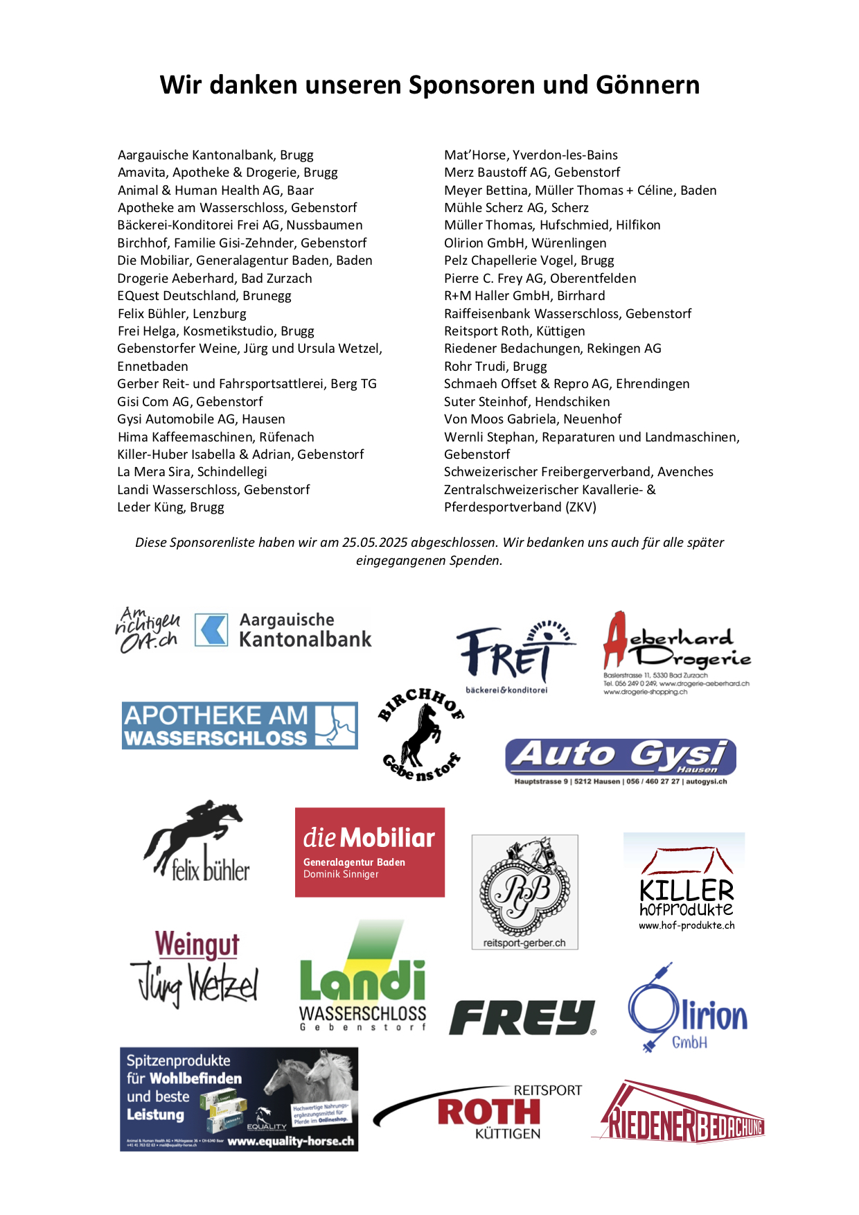 Der Pferdesporttag wären nicht möglich ohne unsere Sponsoren und Gönner. Wir bedanken uns herzlich für Ihre langjährige Treue. Möchten auch Sie unseren Anlass unterstützen? hier finden Sie alle wichtigen Details. Wir danken Ihnen bereits jetzt für Ihren Beitrag.